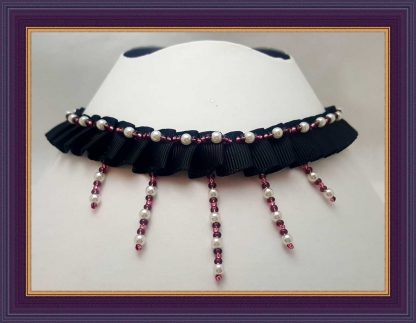 Collier Glamour ras de cou, confectionné avec un joli galon de satin noir plissé, brodé de Lumineuses perles de rocailles Rose tendre et Prune et de perles nacrées écrues en cristal de bohème de 4 mm.