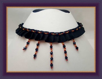 Collier Glamour ras de cou, confectionné avec un joli galon de satin noir plissé, brodé de Lumineuses perles de rocailles Rouge Passion et Dorées.