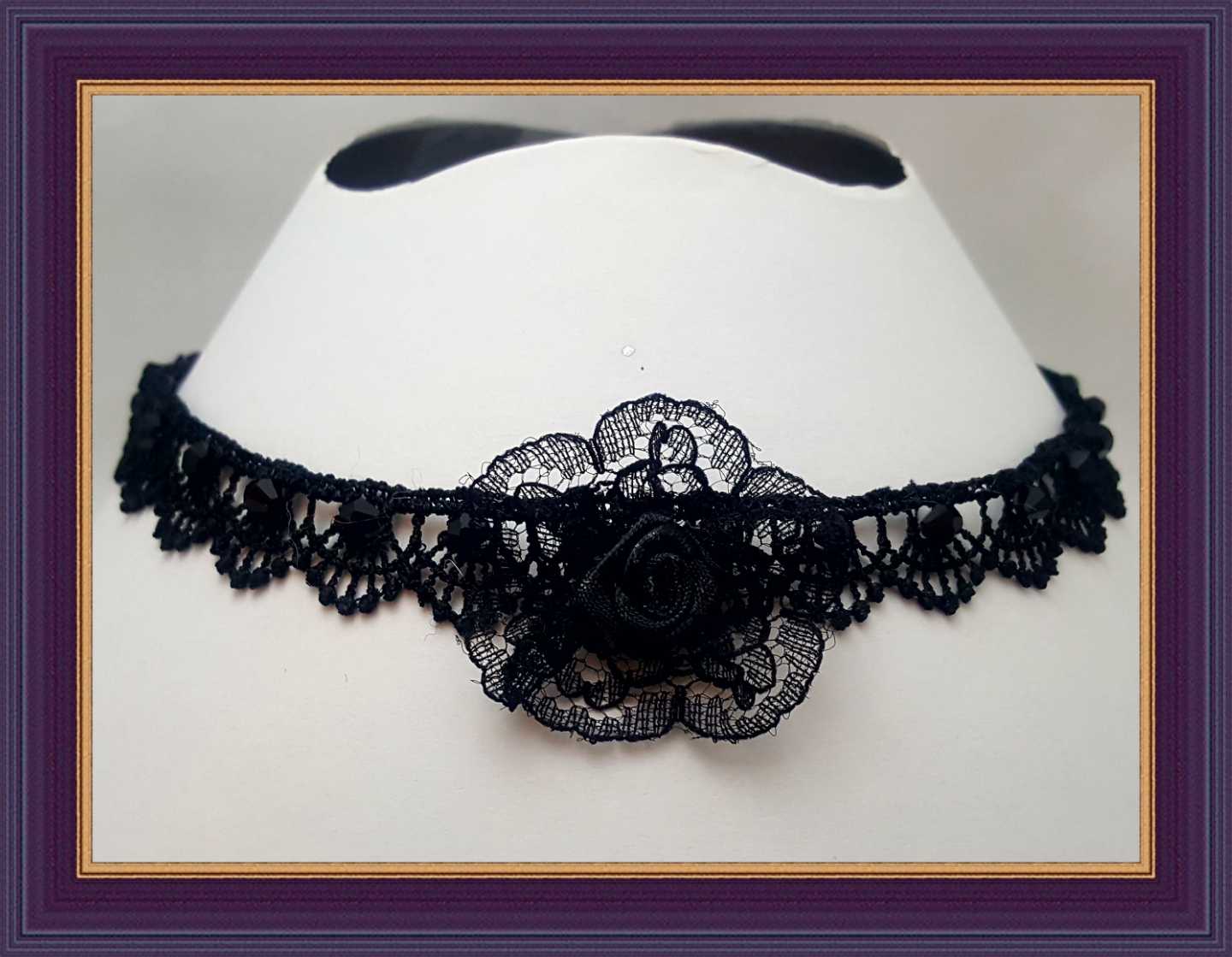 Collier Glamour ras de cou, confectionné avec un joli galon fantaisie noir, orné d’une fleur en dentelle fine et délicate, décorée d’une petite rose en satin noir.